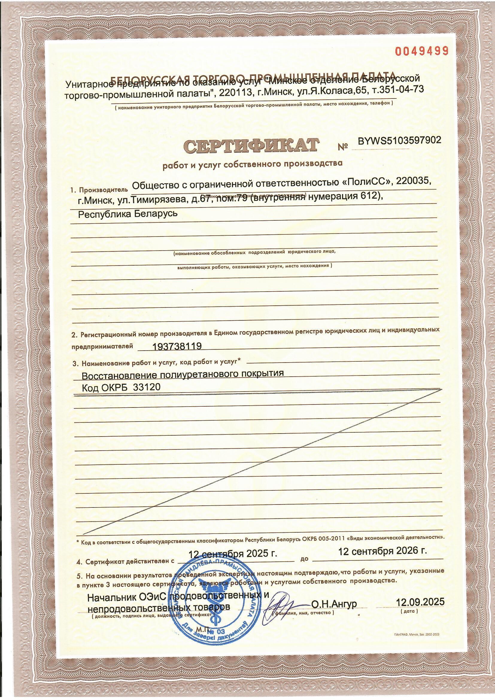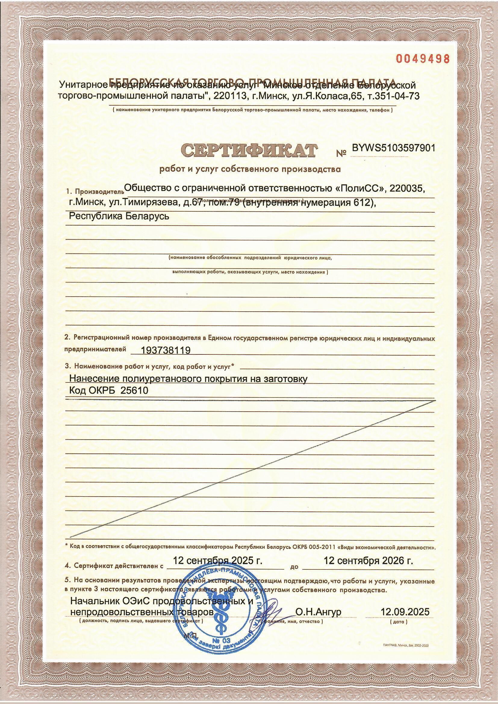 Качество продукции: специалистами нашей компании разработаны Технические условия ТУ BY 193738119.001-2024 «ИЗДЕЛИЯ ФОРМОВЫЕ ИЗ ЛИТЬЕВЫХ ПОЛИУРЕТАНОВ», в соответствии с которыми, на выходном контроле, проверяется качество продукции.